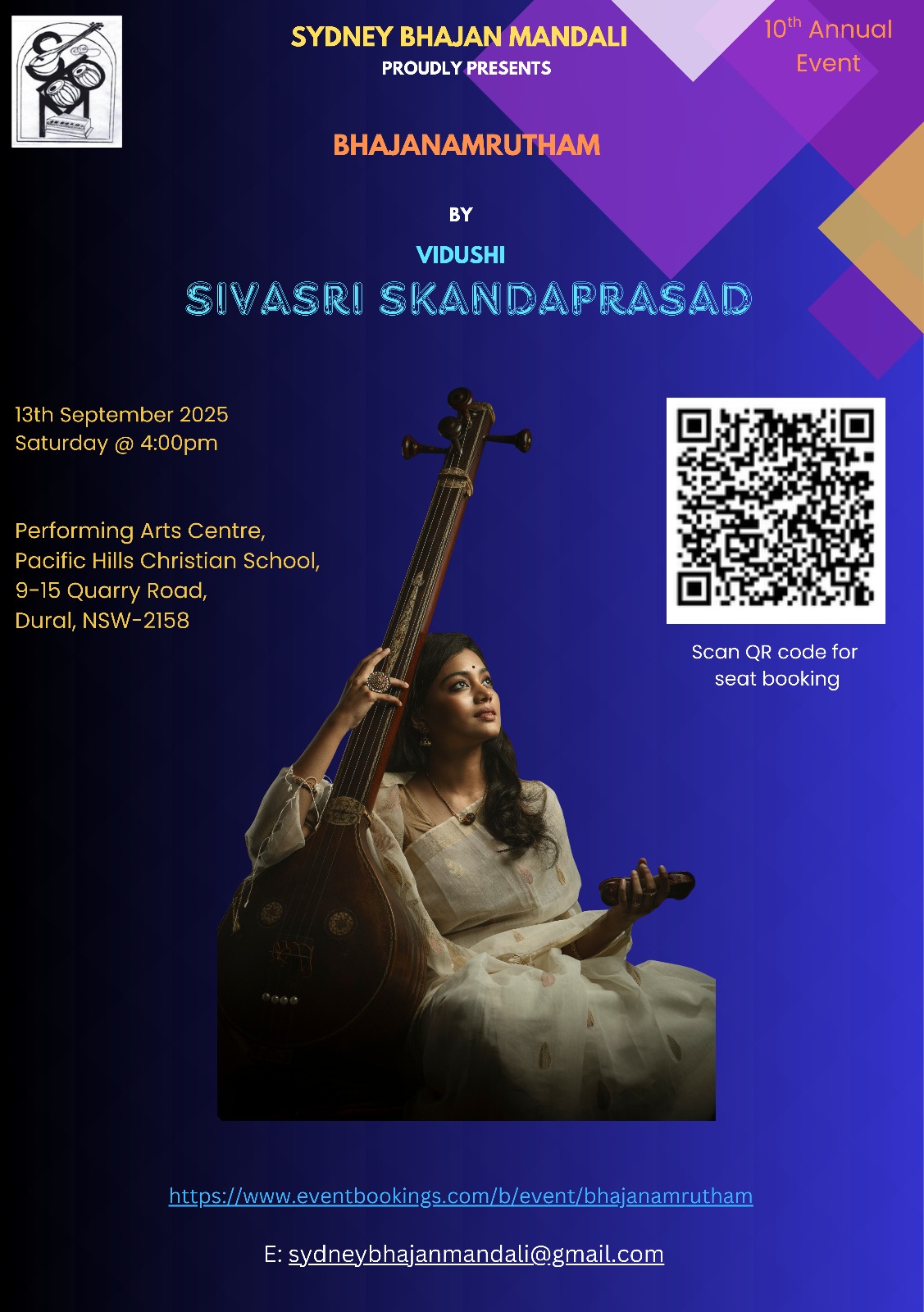 Sydney Bhajan Mandali (SBM) organises bhajan programmes by involving the local professionals on specific important days of Hindu calendar and by the overseas artistes minimum once in a year.